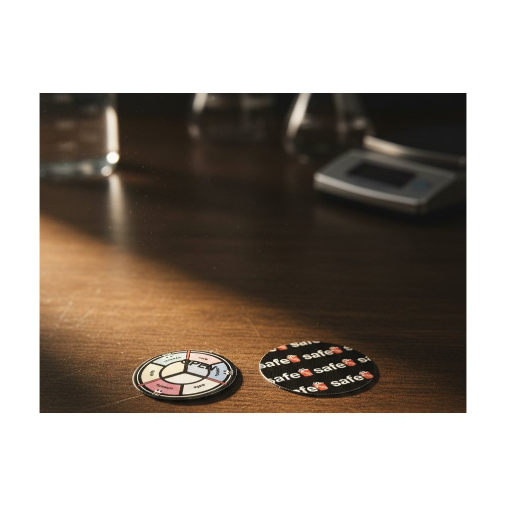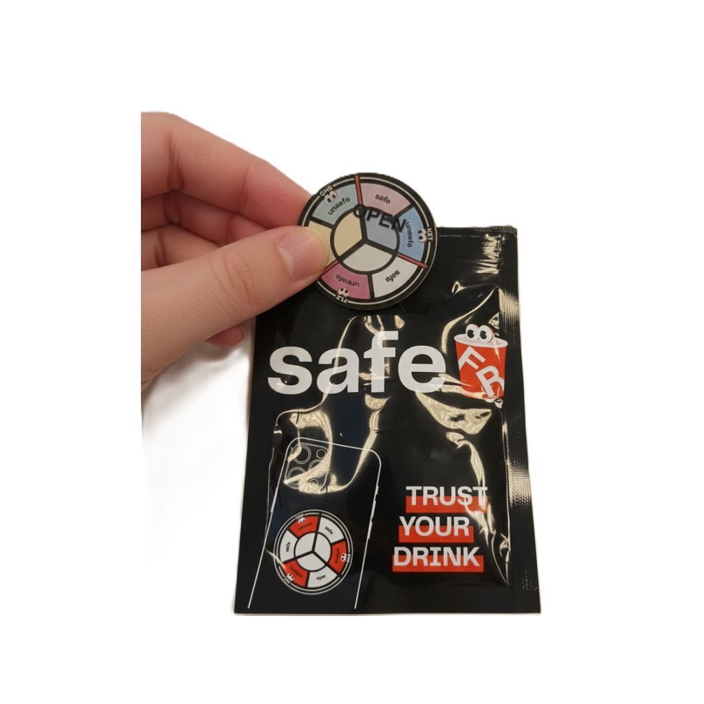 Test je ve formě praktické samolepky, kterou budeš mít vždy po ruce. Přilepíš ji na telefon, peněženku nebo přímo na sklenici. Stačí jedna kapka nápoje a okamžitě víš, zda je drink bezpečný.
