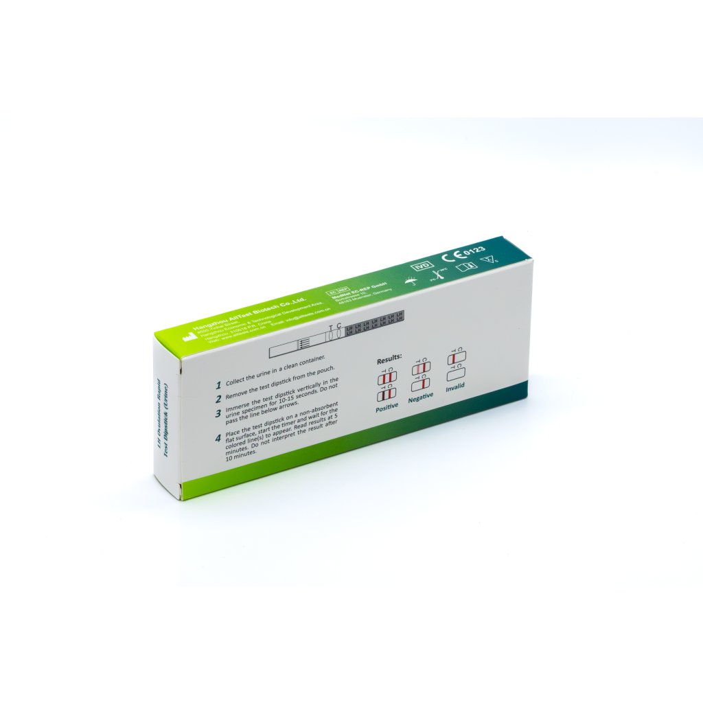 Zkrácený postup: Odeberte vzorek moči do čisté nádobky, ponořte testovací proužek do vzorku po vyznačenou linii na 5 sekund, poté jej položte na rovnou plochu. Výsledek do 10 minut.