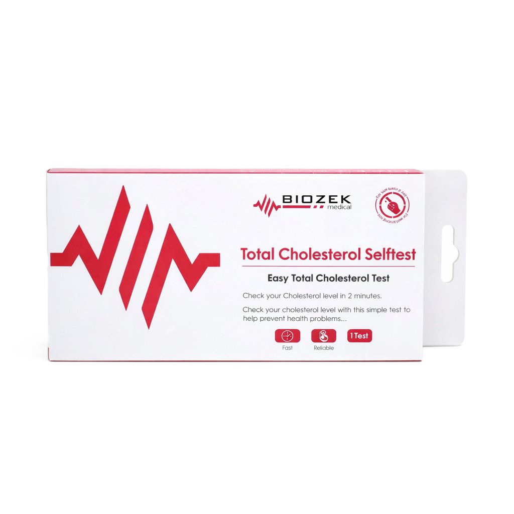 Biozek Total Cholesterol Selftest je spolehlivý domácí test na měření celkového cholesterolu v krvi, určený pro snadné použití bez nutnosti návštěvy lékaře nebo laboratoře. Test se provádí z kapilární krve z konečku prstu a výsledek je znám do 3 minut.