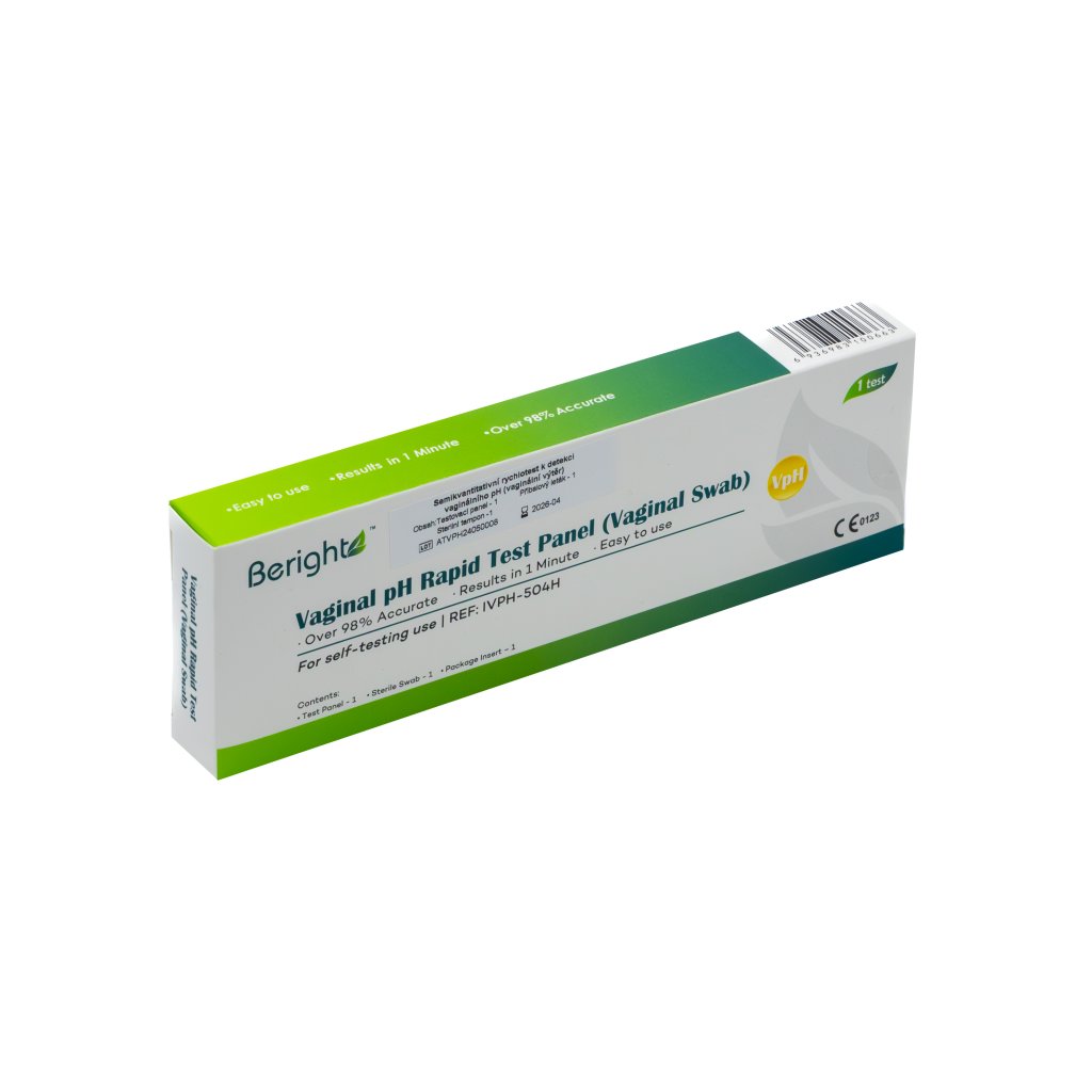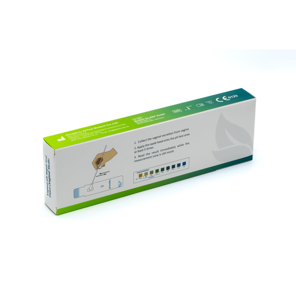 Rychlotest značky AllTest pro orientační stanovení vaginálního pH pomocí samoodběru. Výsledek do 10 minut bez laboratorního vybavení. Určeno pro domácí použití (samotestování).